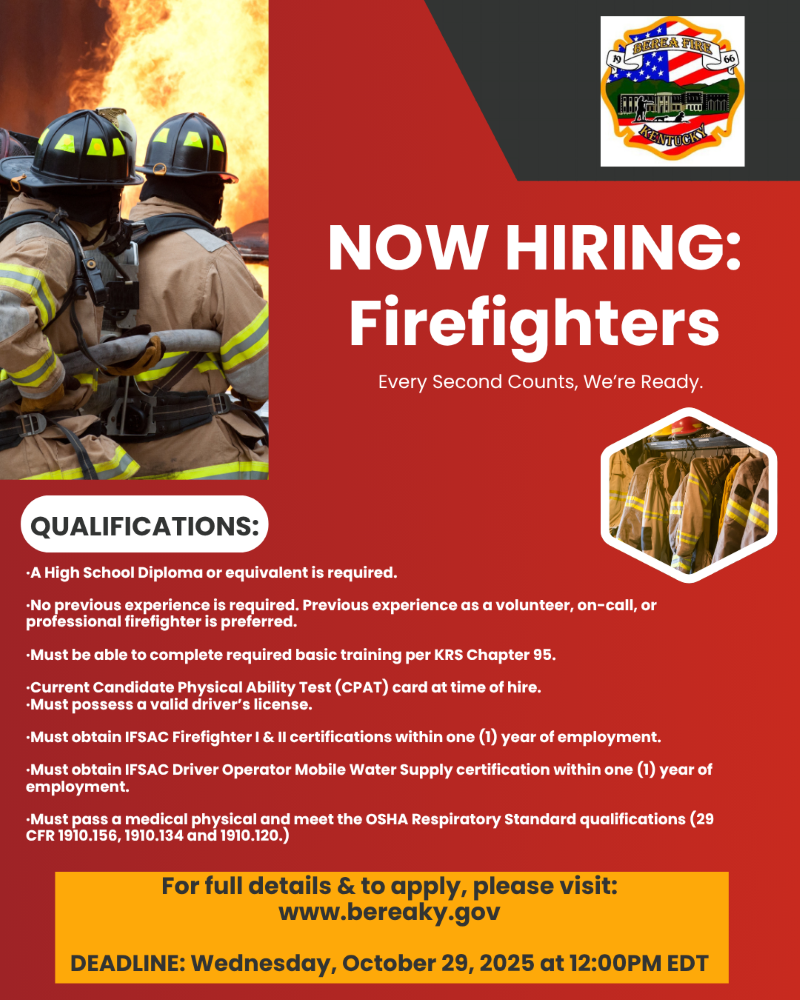 - Firefighter - Berea Fire Department; applications accepted through October 29, 2025