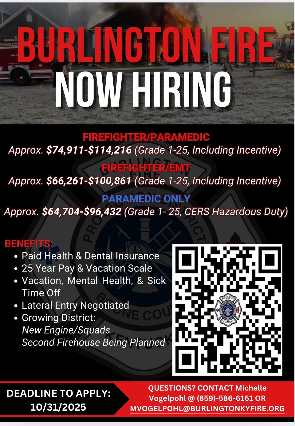 - Firefighter/EMT -or- Firefighter/Paramedic -or- Paramedic (Single-role) - Burlington Fire Protection District; applications accepted through October 31, 2025