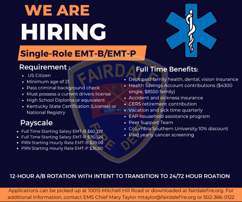 - EMT (Single-role) -or- Paramedic (Single-role) - Fairdale Fire Department;
