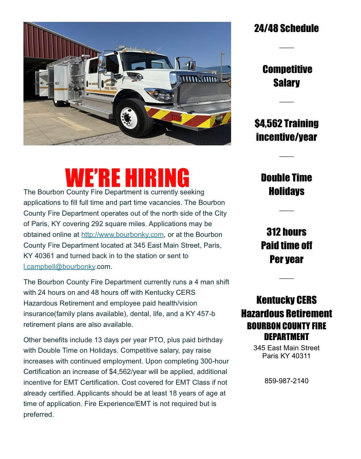- Firefighter/EMT (Full-time and Part-time positions) - Bourbon County Fire Department;