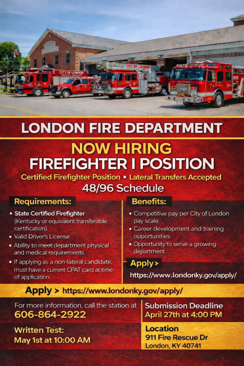 - Firefighter - London Fire Department; applications accepted through April 27, 2026