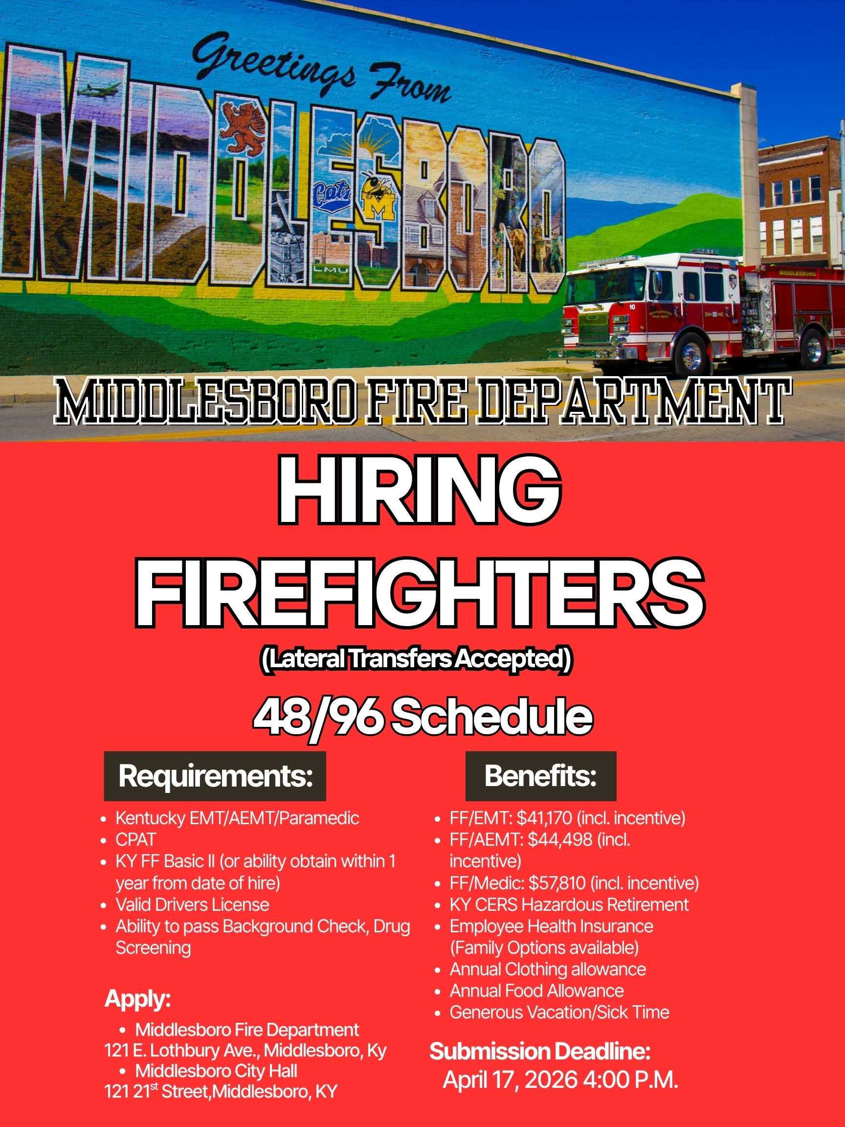 - Firefighter - Middlesboro Fire Department; applications accepted through April 17, 2026