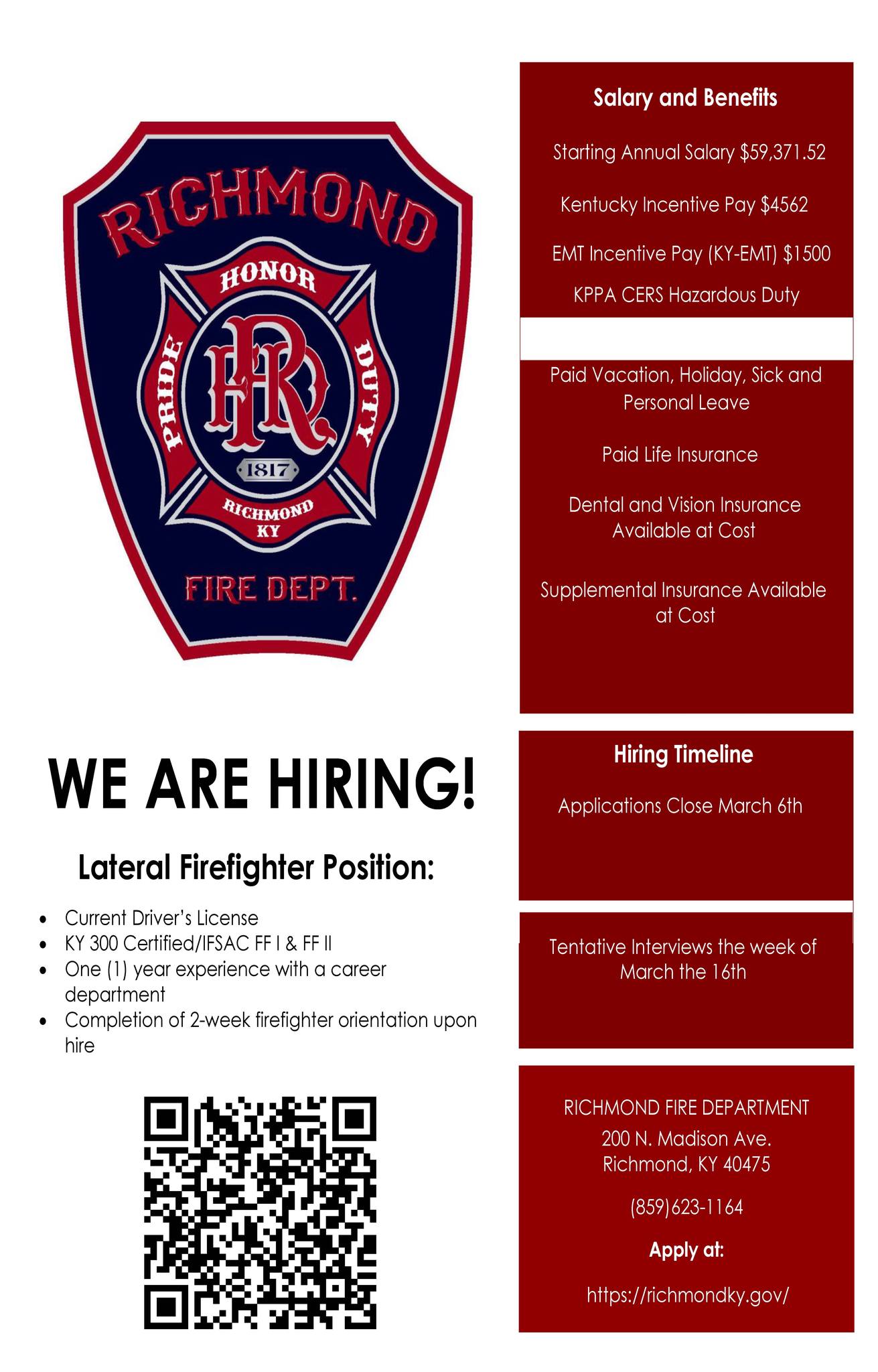 - Firefighter (Lateral) - Richmond Fire Department; applications accepted through March 6, 2026