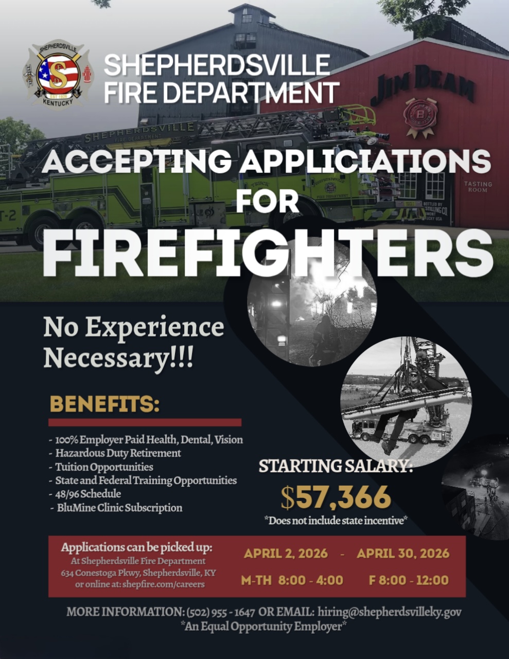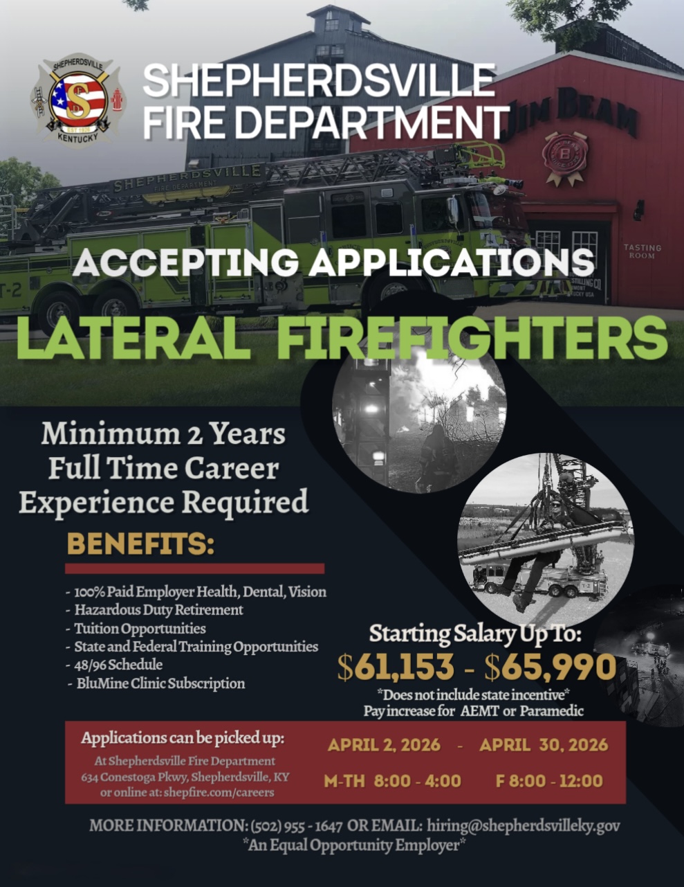 - Firefighter (Lateral) - Shepherdsville Fire Department; applications accepted through April 30, 2026