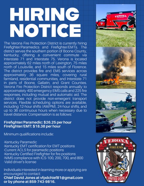 - Firefighter/EMT -or- Firefighter/Paramedic - Verona Fire Protection District;